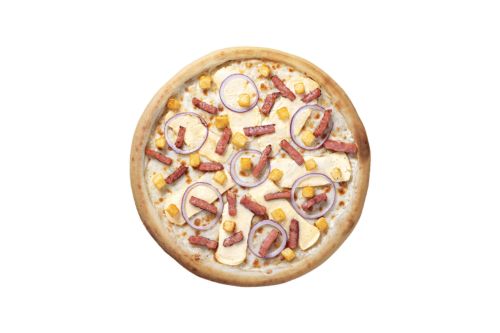 Crème fraîche, mozzarella, lardons, fromage à tartiflette, oignon, origan.